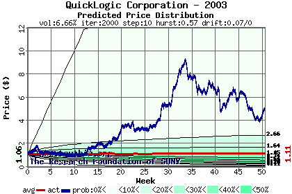 The high to date and low to date prices of the stock plotted against a random walk model for 2003 (what's this?).