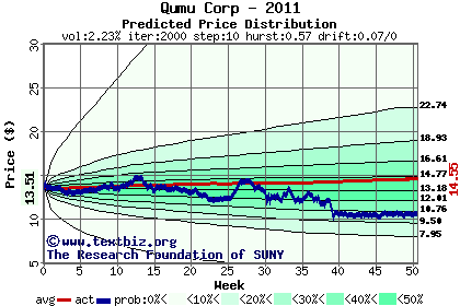 The high to date and low to date prices of the stock plotted against a random walk model for 2011 (what's this?).