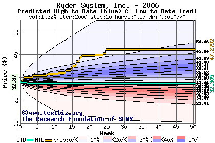 The high to date and low to date prices of the stock plotted against a random walk model for 2006 (what's this?).