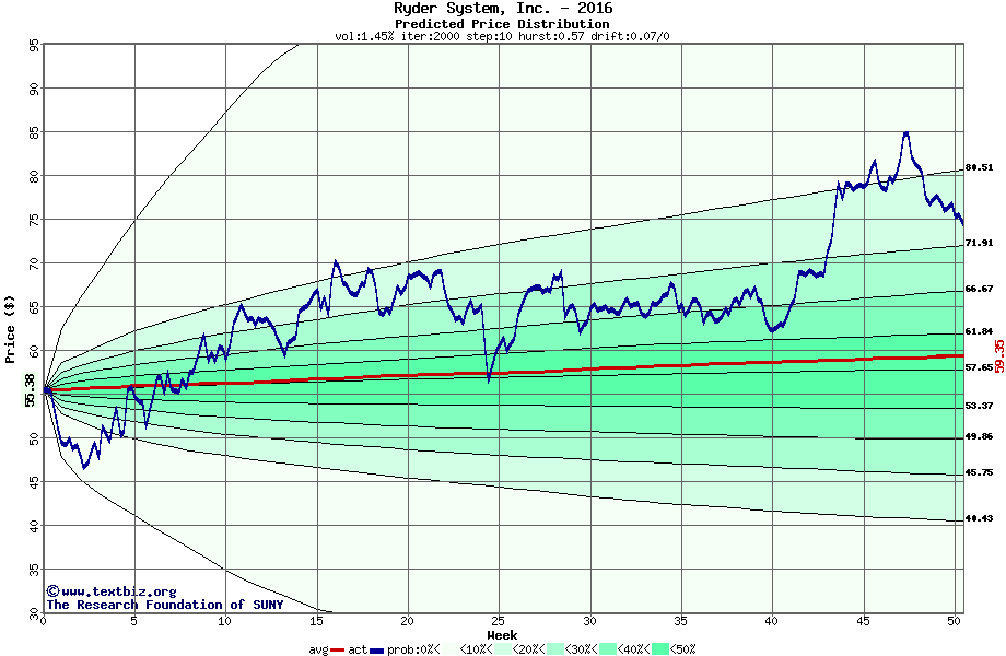 The following graph plots the year-to-date performance of the stock for 2016 compared to the probability calculated by a random walk model.