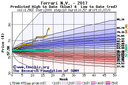 The high to date and low to date prices of the stock plotted against a random walk model for 2017 (what's this?).