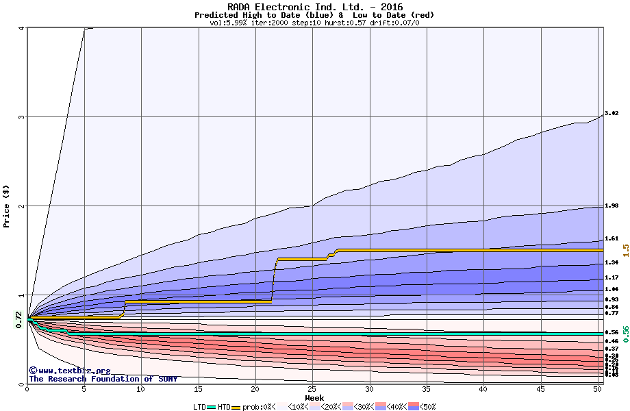 The high to date and low to date prices of the stock plotted against a random walk model for 2016 (what's this?).