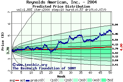 The high to date and low to date prices of the stock plotted against a random walk model for 2004 (what's this?).