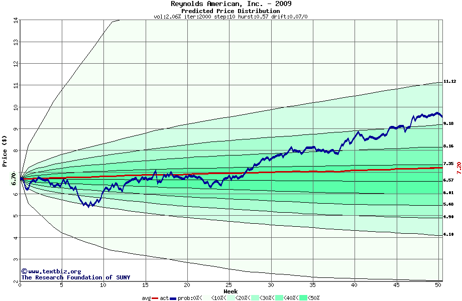 The following graph plots the year-to-date performance of the stock for 2009 compared to the probability calculated by a random walk model.