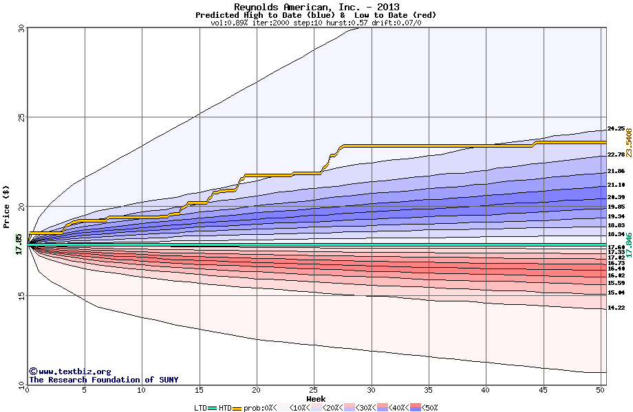The high to date and low to date prices of the stock plotted against a random walk model for 2013 (what's this?).