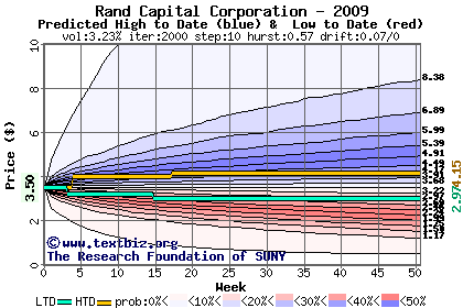 The high to date and low to date prices of the stock plotted against a random walk model for 2009 (what's this?).
