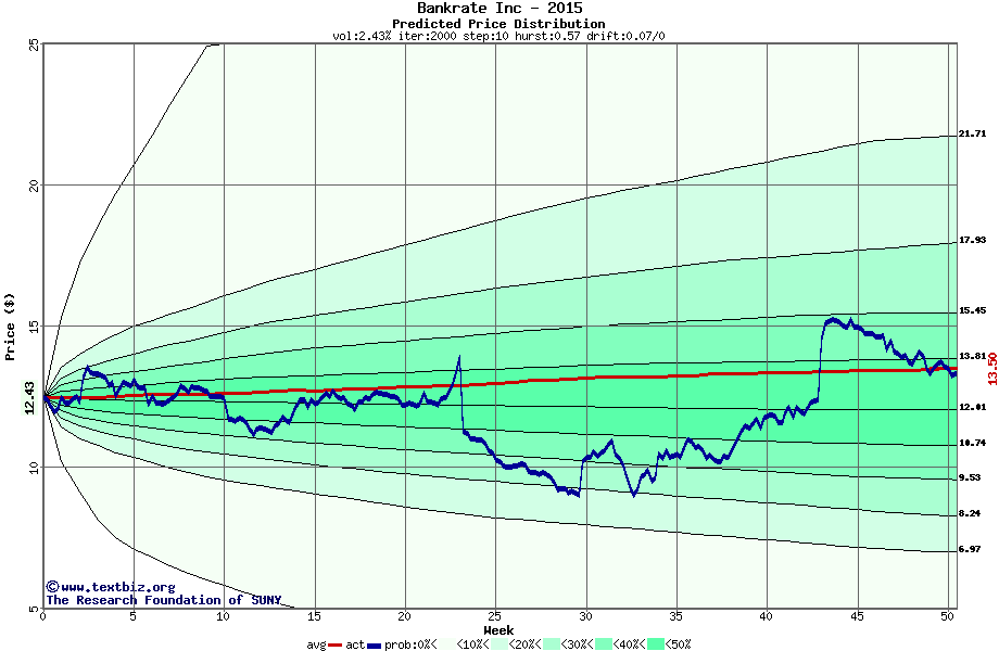 The following graph plots the year-to-date performance of the stock for 2015 compared to the probability calculated by a random walk model.