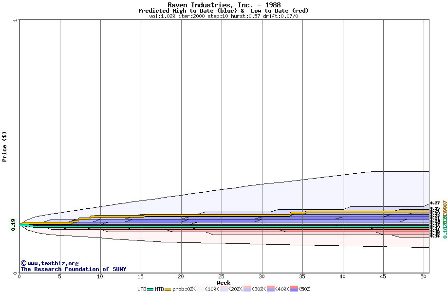 The high to date and low to date prices of the stock plotted against a random walk model for 1988 (what's this?).