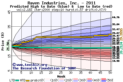 The high to date and low to date prices of the stock plotted against a random walk model for 2011 (what's this?).