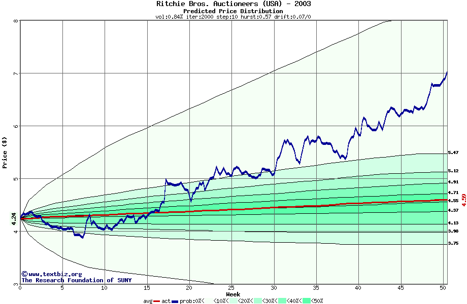 The following graph plots the year-to-date performance of the stock for 2003 compared to the probability calculated by a random walk model.