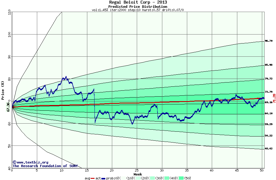 The following graph plots the year-to-date performance of the stock for 2013 compared to the probability calculated by a random walk model.