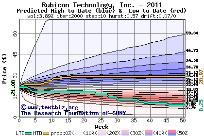 The high to date and low to date prices of the stock plotted against a random walk model for 2011 (what's this?).