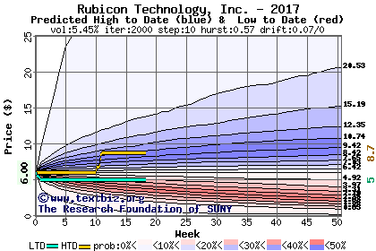 The high to date and low to date prices of the stock plotted against a random walk model for 2017 (what's this?).