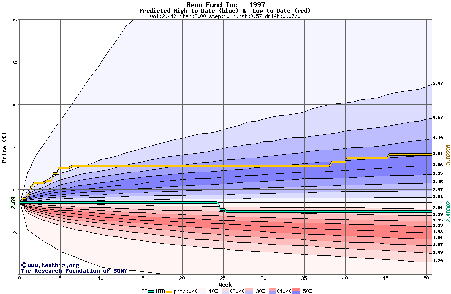 The high to date and low to date prices of the stock plotted against a random walk model for 1997 (what's this?).