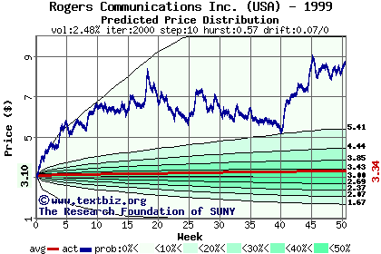 The high to date and low to date prices of the stock plotted against a random walk model for 1999 (what's this?).