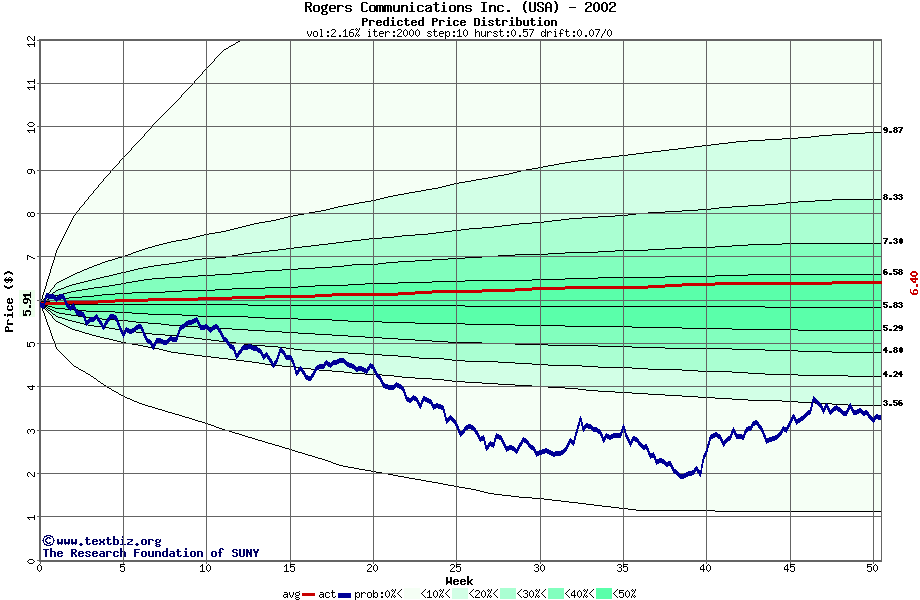 The following graph plots the year-to-date performance of the stock for 2002 compared to the probability calculated by a random walk model.