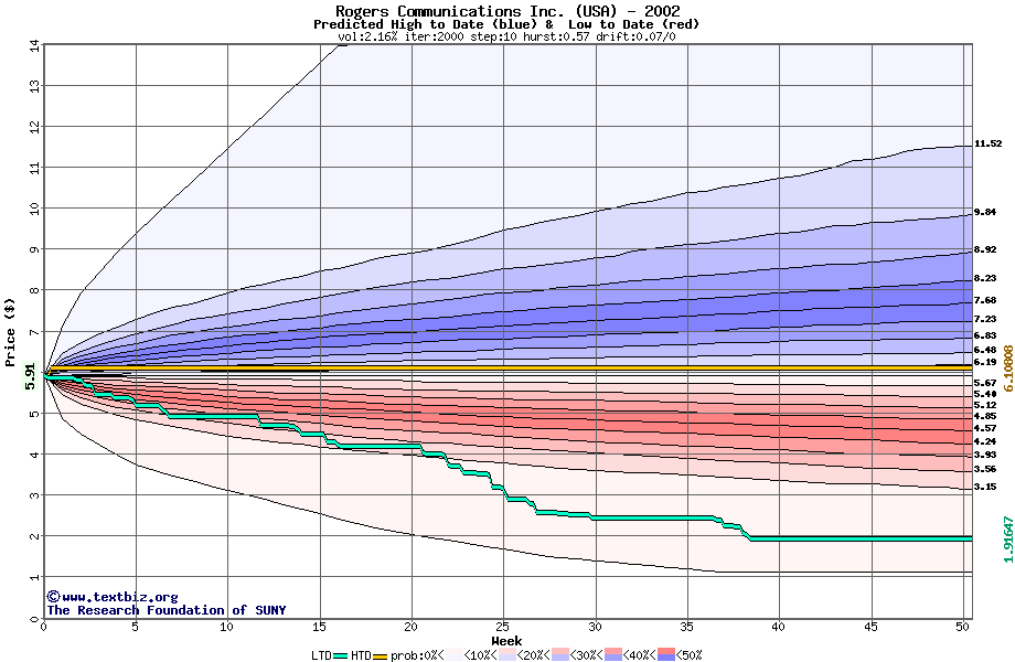 The high to date and low to date prices of the stock plotted against a random walk model for 2002 (what's this?).