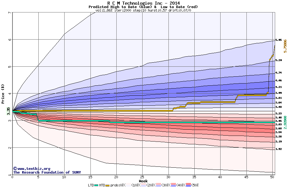 The high to date and low to date prices of the stock plotted against a random walk model for 2014 (what's this?).