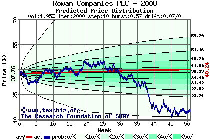 The following graph plots the year-to-date performance of the stock for 2008 compared to the probability calculated by a random walk model.