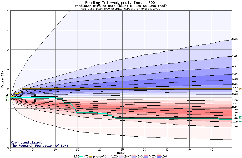 The high to date and low to date prices of the stock plotted against a random walk model for 2001 (what's this?).