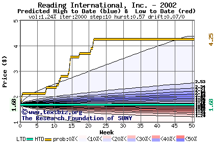 The high to date and low to date prices of the stock plotted against a random walk model for 2002 (what's this?).