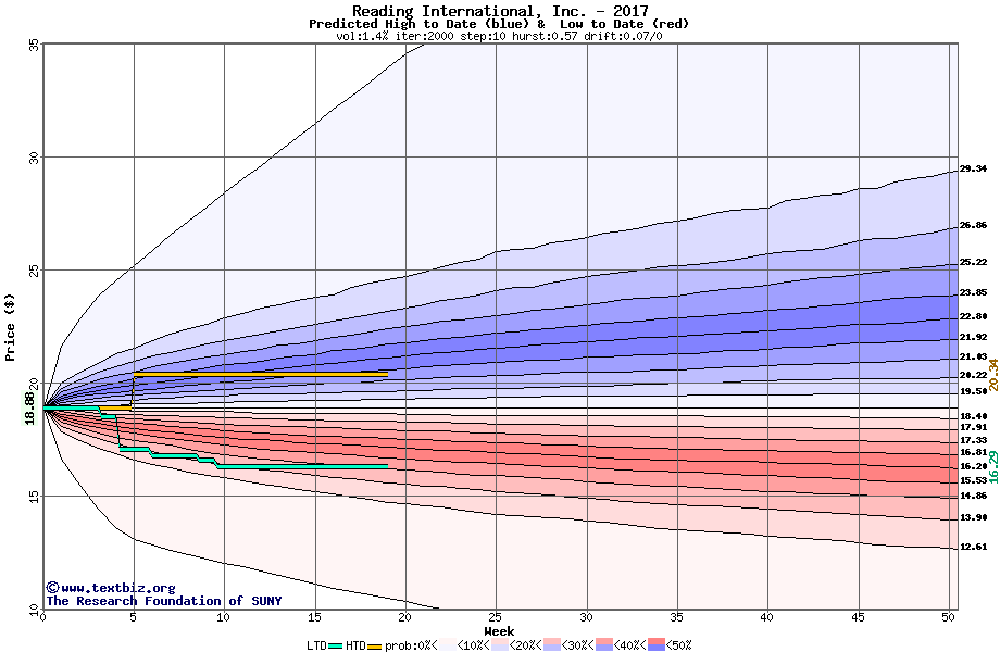 The high to date and low to date prices of the stock plotted against a random walk model for 2017 (what's this?).
