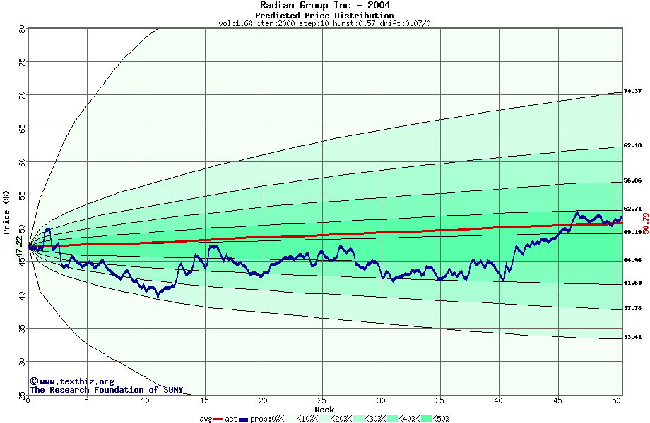 The following graph plots the year-to-date performance of the stock for 2004 compared to the probability calculated by a random walk model.