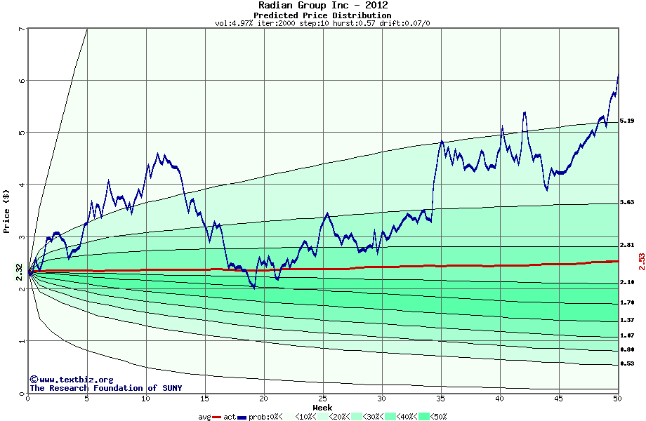 The high to date and low to date prices of the stock plotted against a random walk model for 2012 (what's this?).