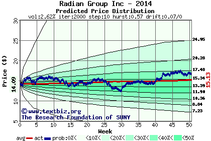 The high to date and low to date prices of the stock plotted against a random walk model for 2014 (what's this?).