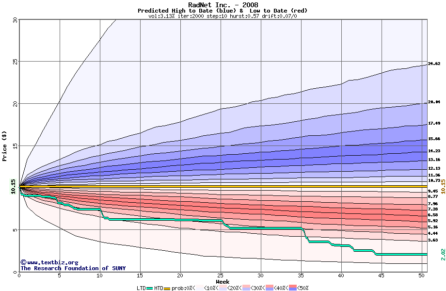 The high to date and low to date prices of the stock plotted against a random walk model for 2008 (what's this?).