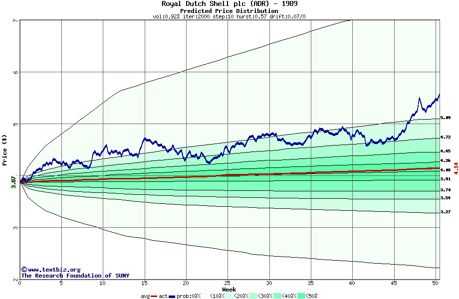 The following graph plots the year-to-date performance of the stock for 1989 compared to the probability calculated by a random walk model.
