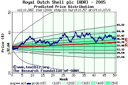 The following graph plots the year-to-date performance of the stock for 2005 compared to the probability calculated by a random walk model.