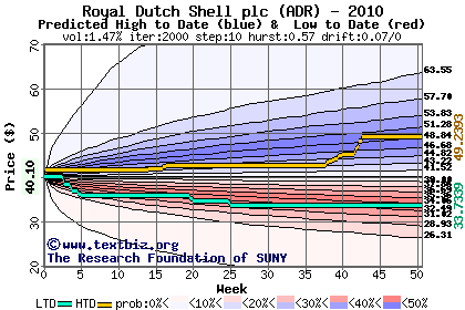 The high to date and low to date prices of the stock plotted against a random walk model for 2010 (what's this?).