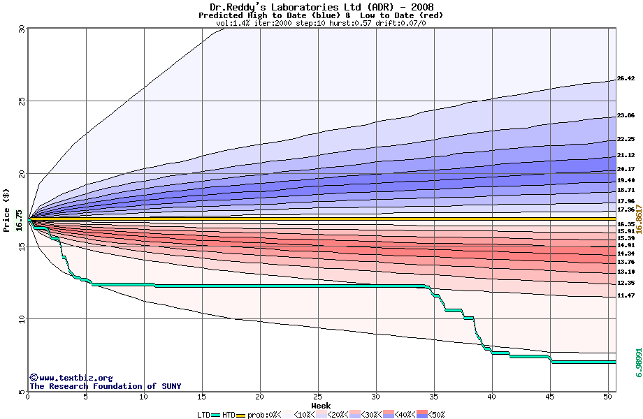 The high to date and low to date prices of the stock plotted against a random walk model for 2008 (what's this?).