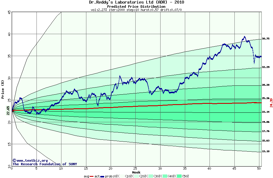 The following graph plots the year-to-date performance of the stock for 2010 compared to the probability calculated by a random walk model.