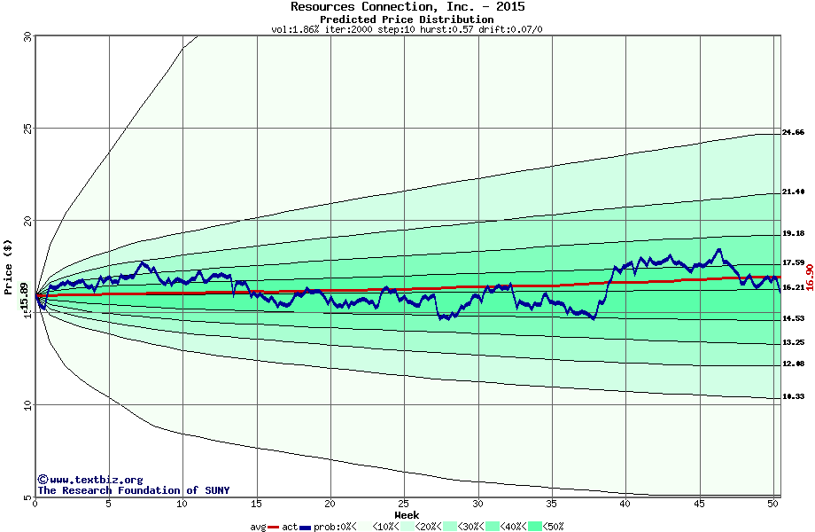The following graph plots the year-to-date performance of the stock for 2015 compared to the probability calculated by a random walk model.