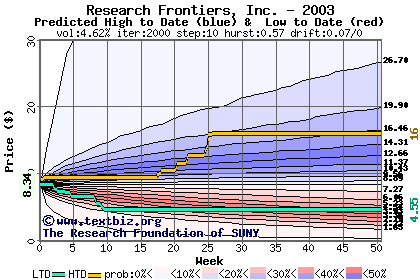 The high to date and low to date prices of the stock plotted against a random walk model for 2003 (what's this?).