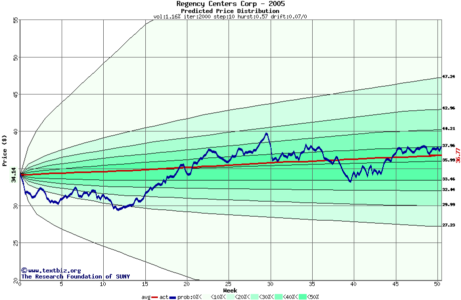 The following graph plots the year-to-date performance of the stock for 2005 compared to the probability calculated by a random walk model.