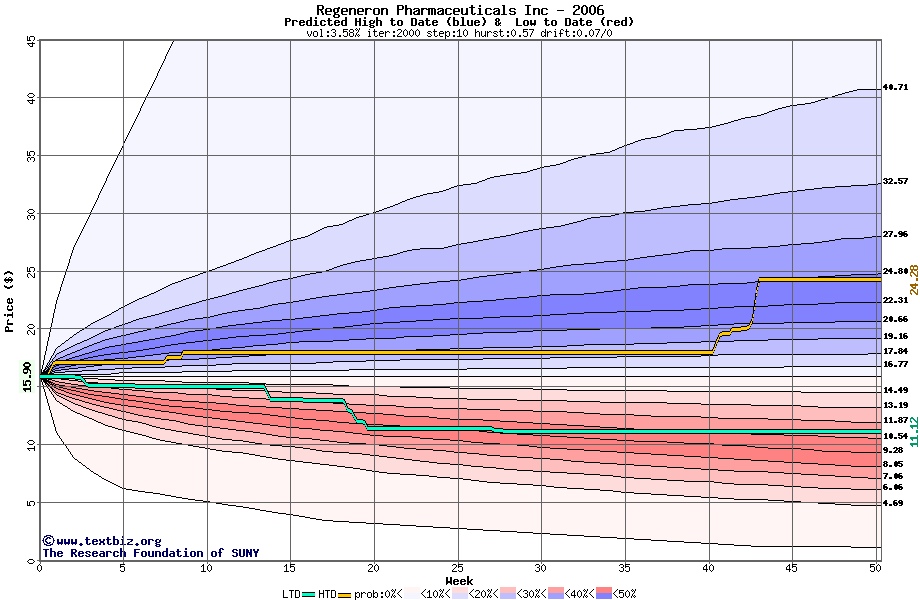 The high to date and low to date prices of the stock plotted against a random walk model for 2006 (what's this?).