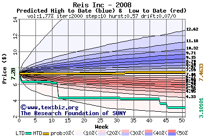 The high to date and low to date prices of the stock plotted against a random walk model for 2008 (what's this?).
