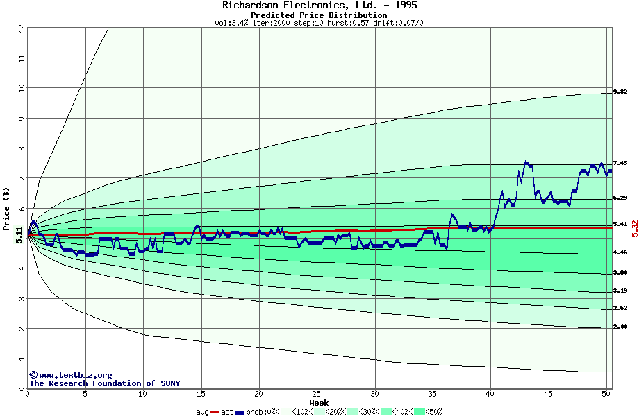 The following graph plots the year-to-date performance of the stock for 1995 compared to the probability calculated by a random walk model.