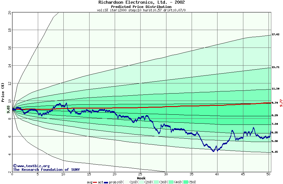 The following graph plots the year-to-date performance of the stock for 2002 compared to the probability calculated by a random walk model.