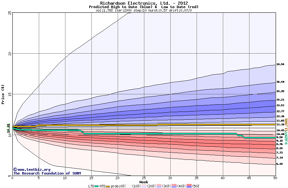 The high to date and low to date prices of the stock plotted against a random walk model for 2012 (what's this?).