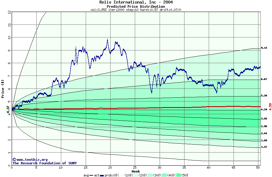 The following graph plots the year-to-date performance of the stock for 2004 compared to the probability calculated by a random walk model.