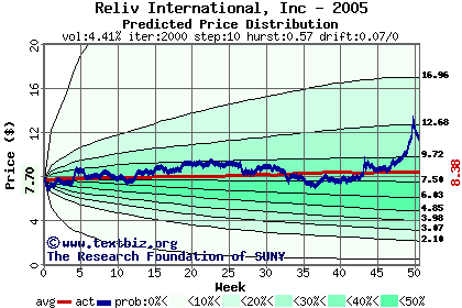 The following graph plots the year-to-date performance of the stock for 2005 compared to the probability calculated by a random walk model.