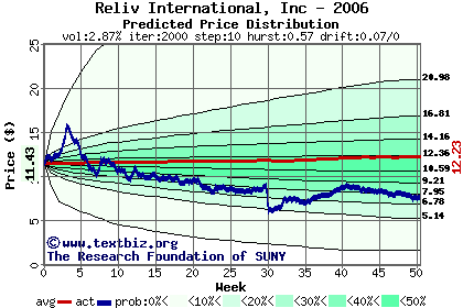 The high to date and low to date prices of the stock plotted against a random walk model for 2006 (what's this?).