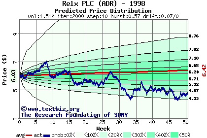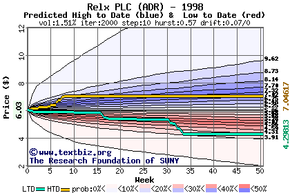 The high to date and low to date prices of the stock plotted against a random walk model for 1998 (what's this?).