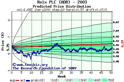 The high to date and low to date prices of the stock plotted against a random walk model for 2003 (what's this?).