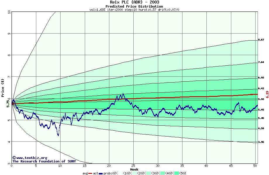 The following graph plots the year-to-date performance of the stock for 2003 compared to the probability calculated by a random walk model.