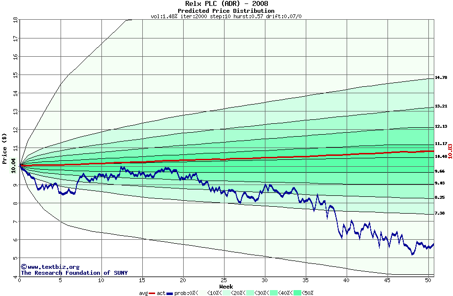 The following graph plots the year-to-date performance of the stock for 2008 compared to the probability calculated by a random walk model.